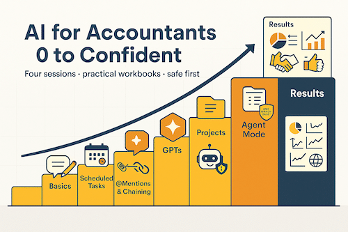 Practical, safe and simple. Four 90-minute sessions with workbooks and copy-paste prompts. Built for accountants who want quick wins, not jargon.